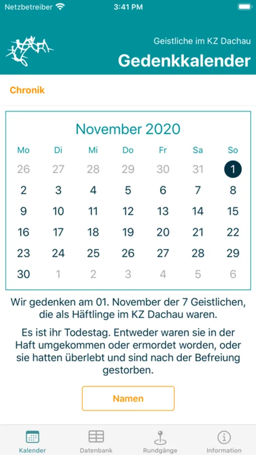 The main elements contained in the “Clergy in Dachau Concentration Camp” app are an interactive Memorial Calendar and a database with research function.
