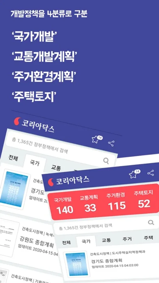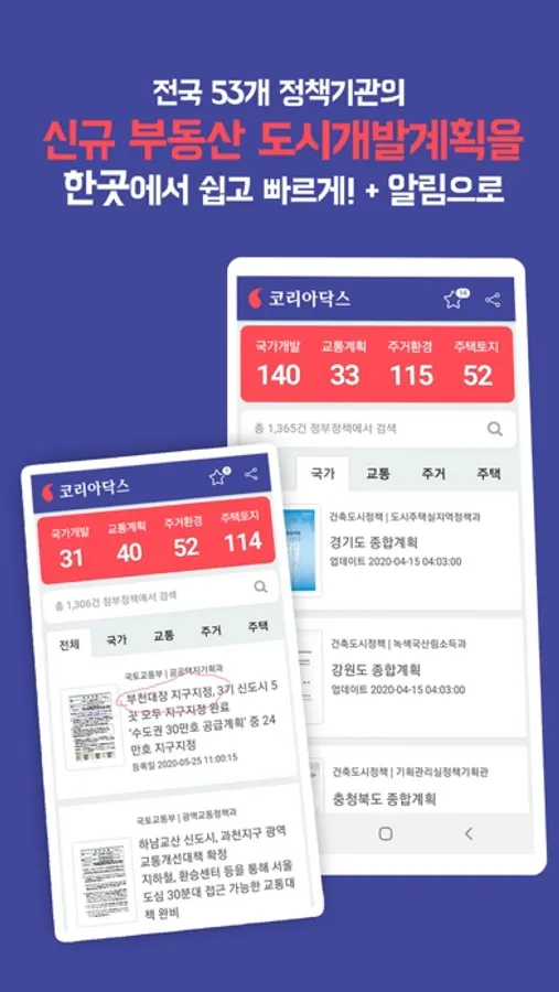전국 53개 정책기관의 국토종합계획과 매일 새로운 도시별 개발계획, 도로교통 확장계획, 부동산 개발정책을 가장 빠르게 알림으로 제공드리며, 한곳에서 쉽고 바로 볼 수 있도록 제공합니다.