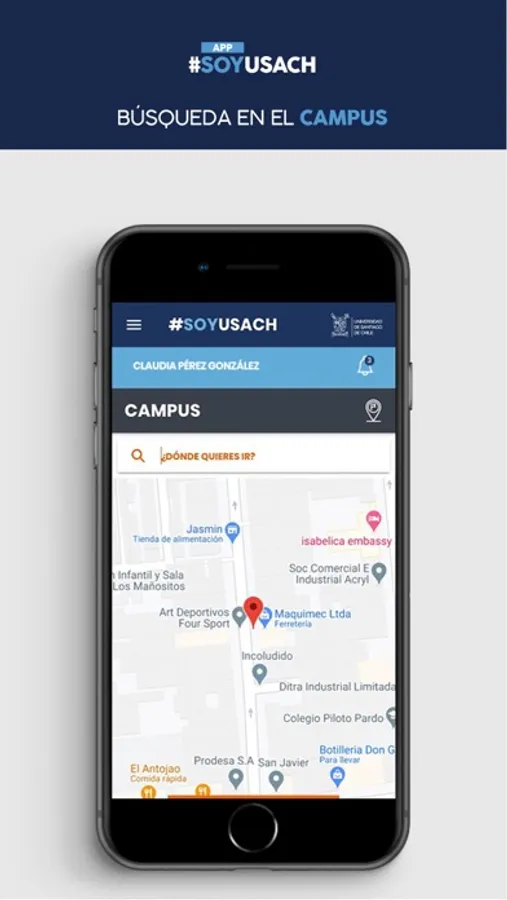 Sección de la APP con los principales puntos referenciales del campus de la Universidad de Santiago de Chile.