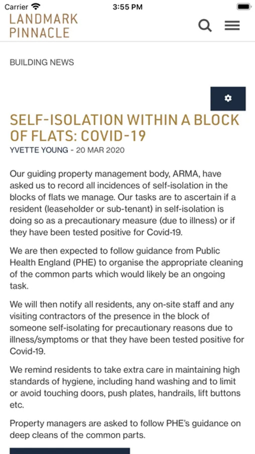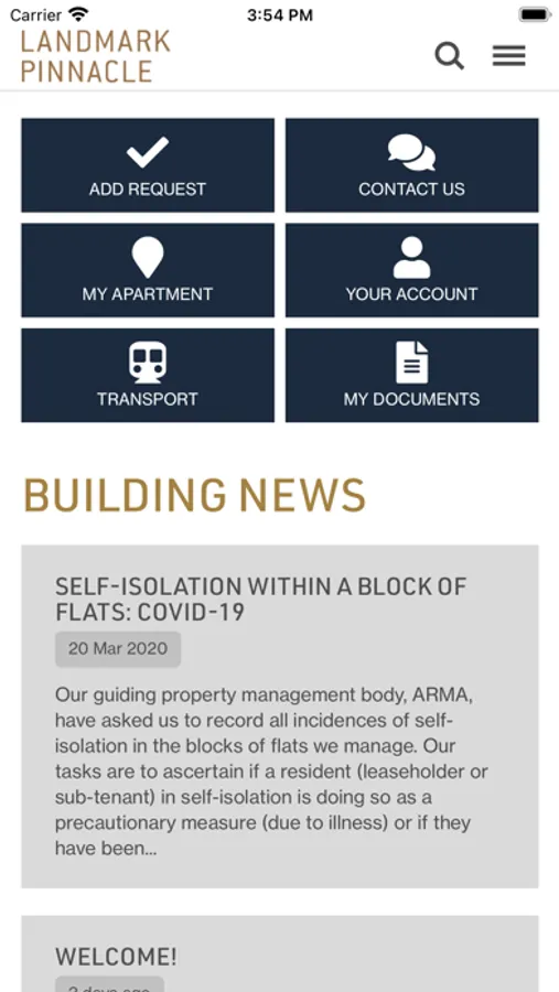 – Is the building’s summary page. It shows the latest stories, details of contacts and requests, forthcoming dates, and useful web-links.