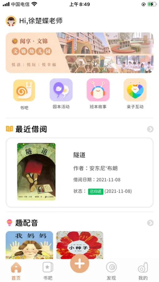 杭州市文锦幼儿园“智慧图书室”系统项目是幼儿园提高图书借阅利用率的新模式,采用语音合成技术,简化图书借还操作流程,让幼儿真正做到图书的自助借阅。小蜗牛智慧书APP包含4大板块