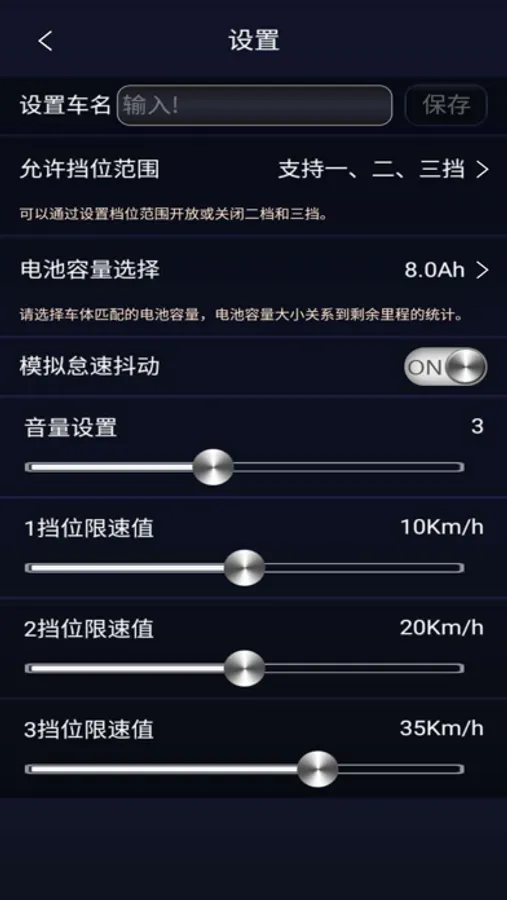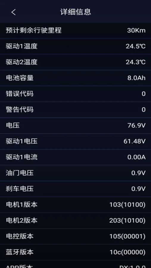 This is a go kart app. The detailed information of the vehicle can be viewed through app, and the vehicle parameters can be set. It supports timing, circle counting, and firmware upgrade.