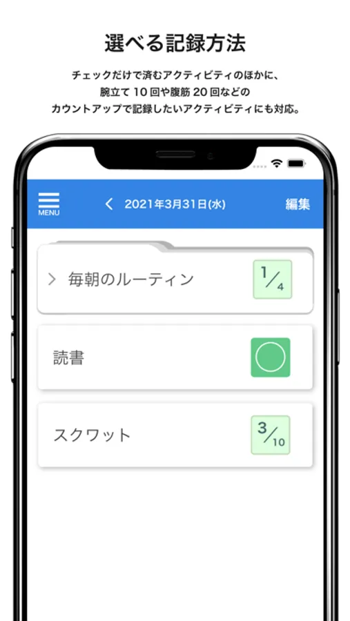 チェックだけで済むアクティビティのほかに、腕立て10回や腹筋20回などのカウントアップで記録したいアクティビティにも対応。