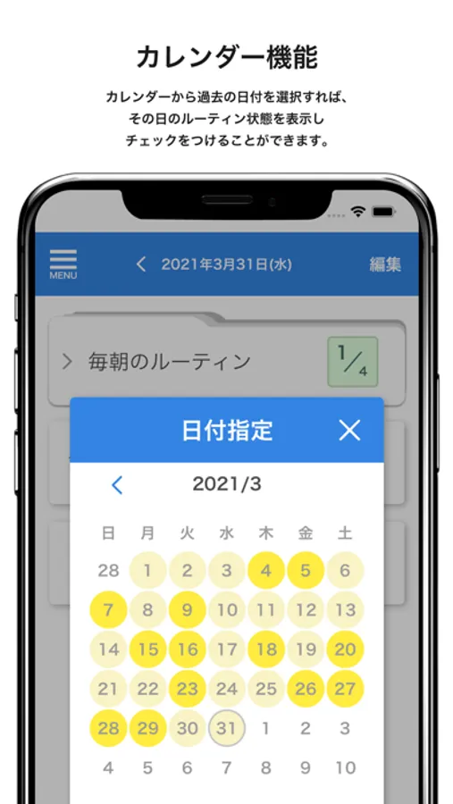 カレンダーから過去の日付を選択すれば、その日のルーティン状態を表示しチェックをつけることができます。