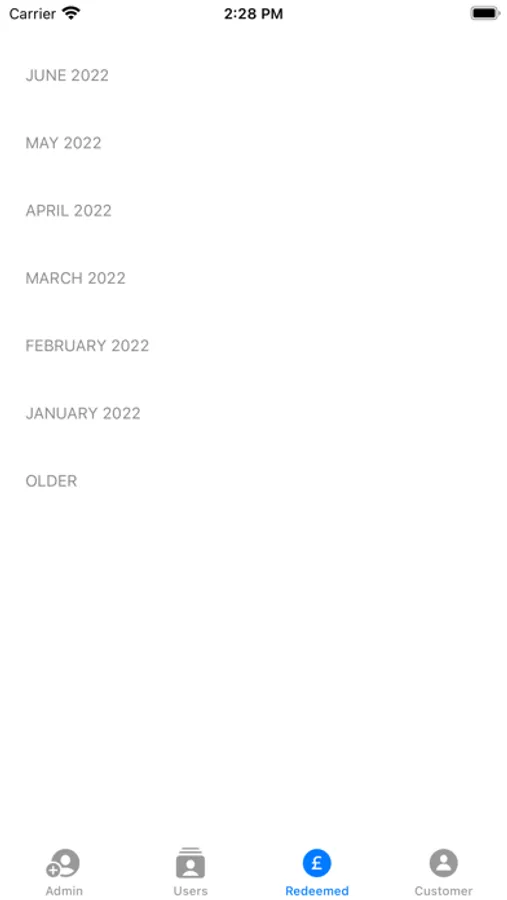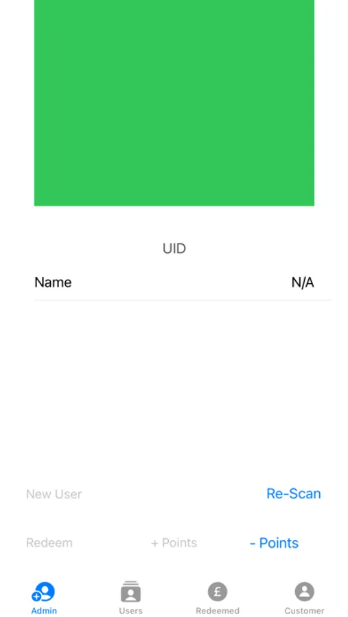 Admin mode has additional tabs for scanning QR codes, checking user info and points as well as when points are redeemed