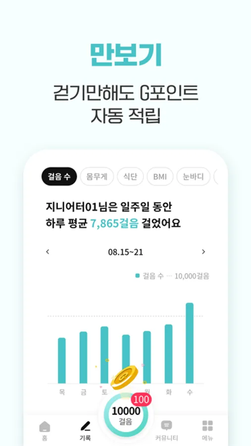 - 걷기만해도 포인트받는 만보기와 함께 성취감을 느껴 보세요!