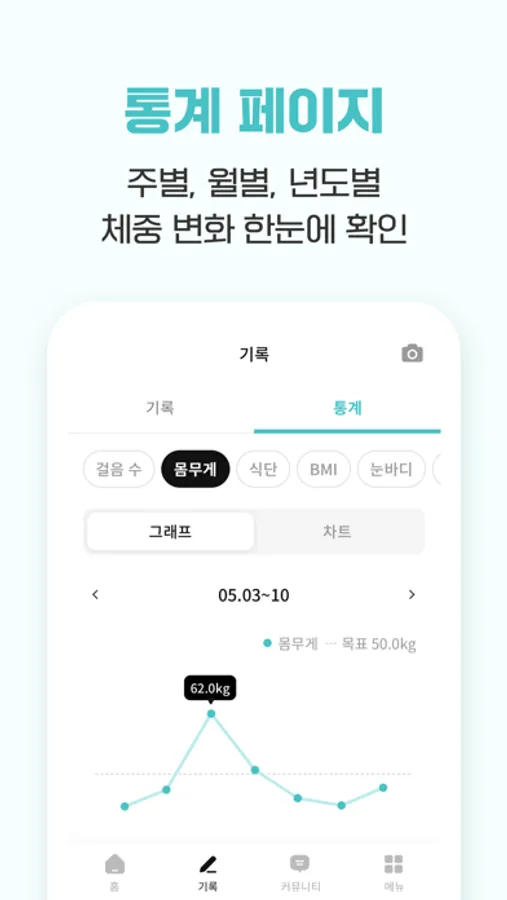 ■ 통계 페이지에서 체중 변화를 한눈에 확인할 수 있어요