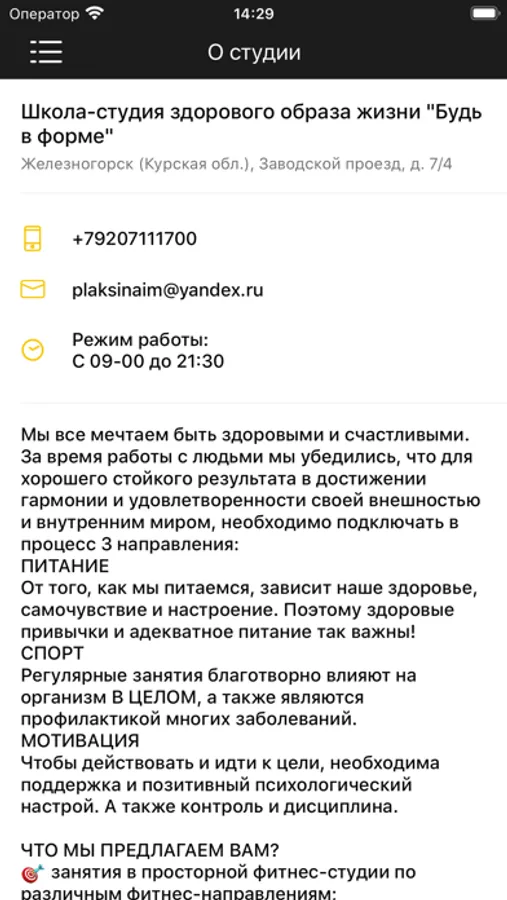С помощью приложения вы можете следить за новостями, расписанием клубов, оперативно получать информацию об изменениях в расписании и специальных предложениях и акциях. В мобильном приложении для вас доступны: