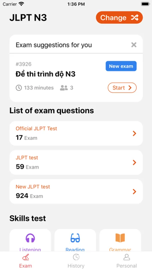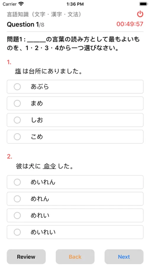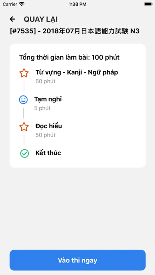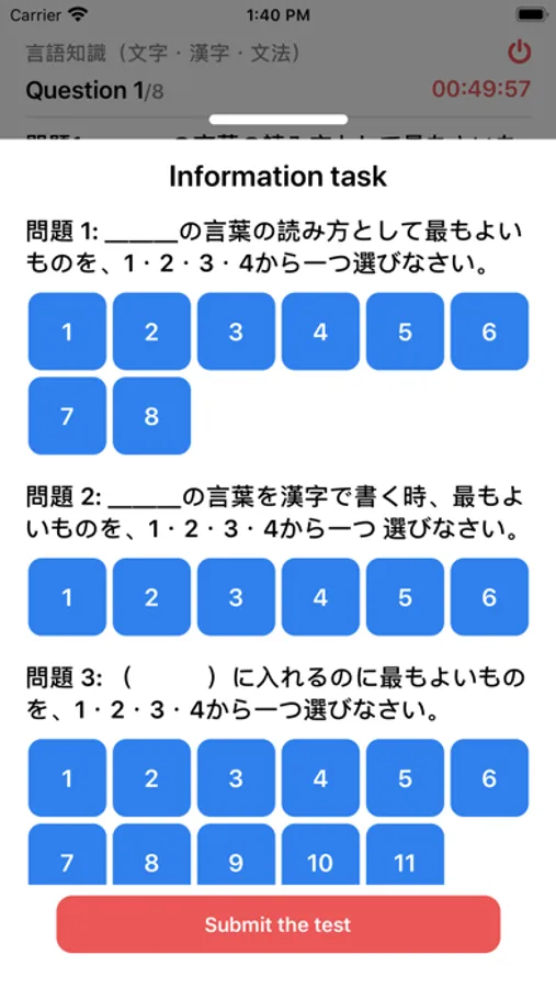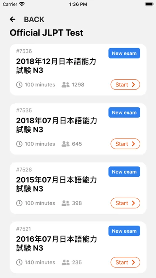 Users can access to practice tests in standard structure of the Japanese-Language Proficiency Test (JLPT).