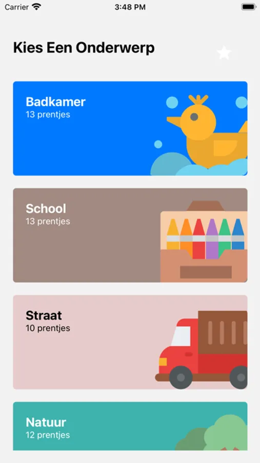De belangrijkste woordjes per thema, een heldere prent en ingesproken in het Nederlands. Samen sterretjes verzamelen door alle woordjes in te oefenen.