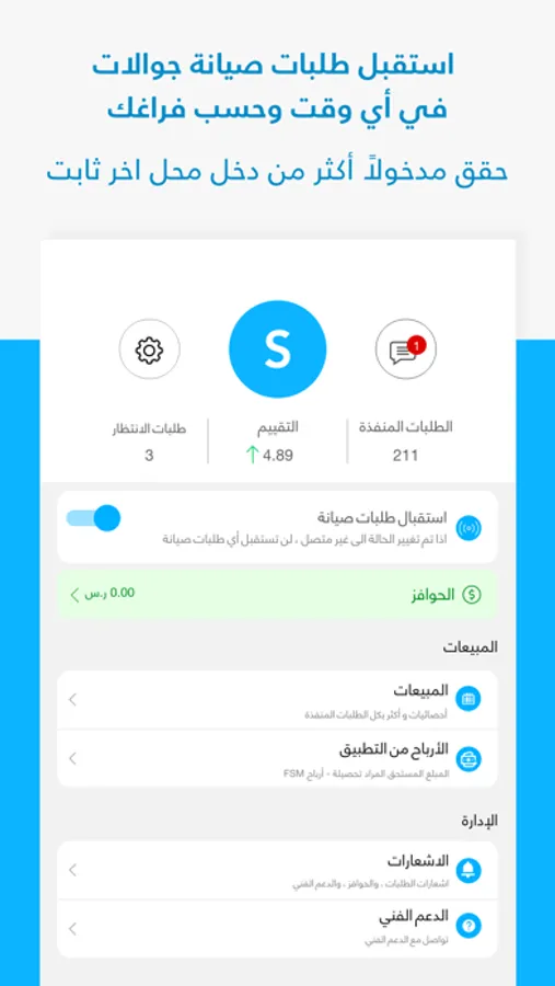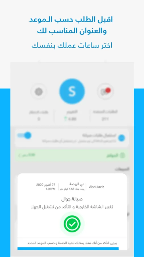 ● أستقبل طلبات في وقت فراغك. ( يظهر لك تفاصيل الطلب الجوال و المشكلة و السعر و الموعد المحدد من العميل ).