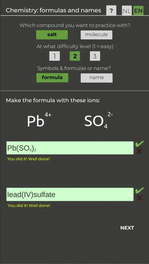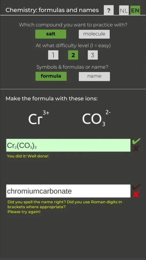 Make chemical formulas from ions or atoms and give the right name for the compound. You can also choose to make a formula for a given salt or molecule name.