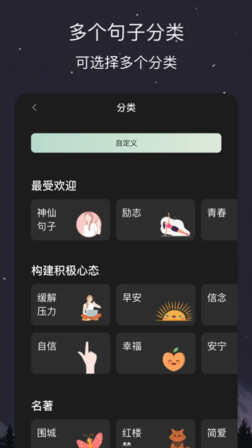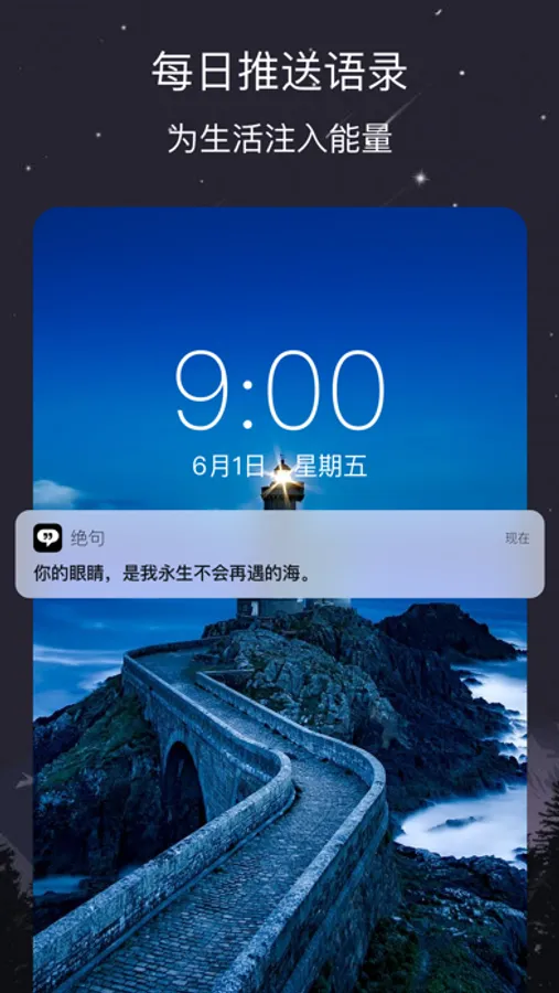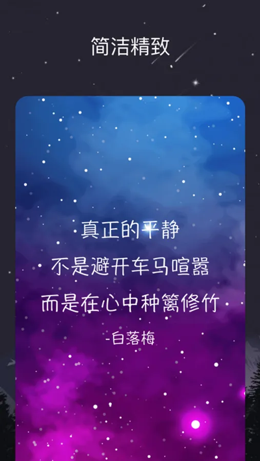 绝句是个句子摘抄平台,里面多种类型和风格的句子:好词好句、唯美金句、作文素材、治愈、文案、毒鸡汤,还有类似句读、纸条、句子控等类型的内容。而且,为了让您获得良好的阅读体验,我们设计了精致的的排版、精美的主题。绝句是所有句子迷的宝藏app。