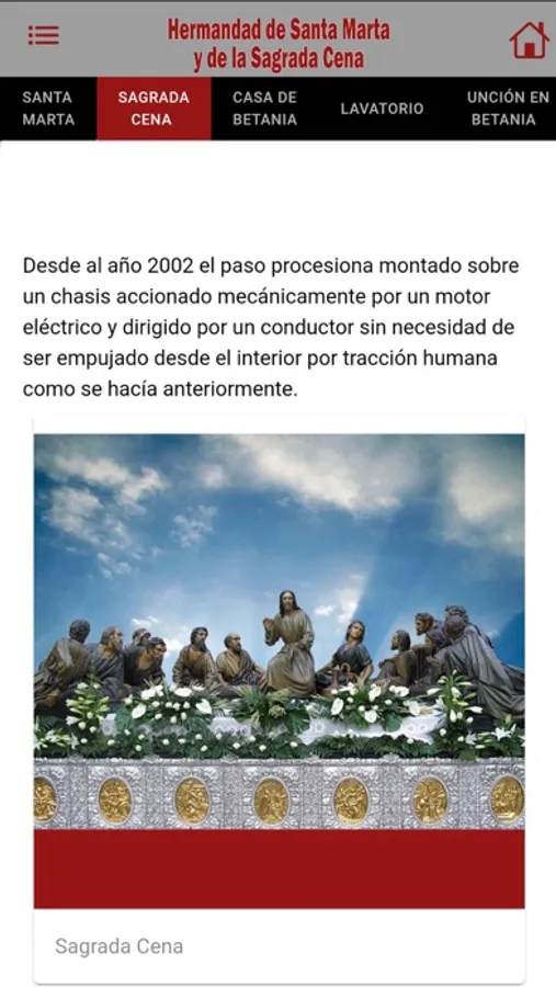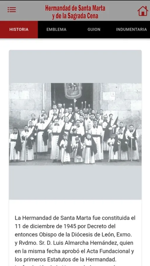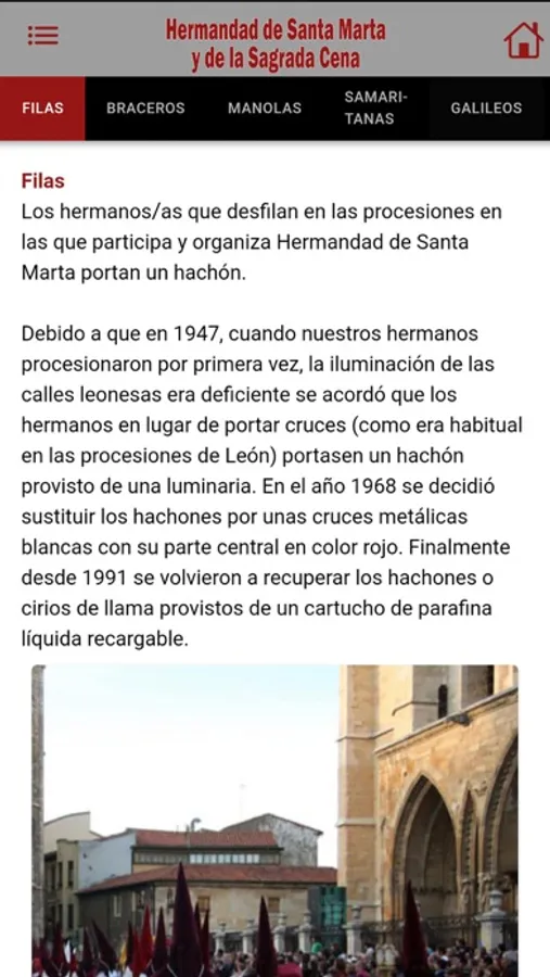 Se puede encontrar todos los datos, noticias, fotos, videos, etc de la Hermandad de Santa Marta y de la Sagrada Cena de León (España). También se muestra el recorrido de las procesiones, todos los pasos y las diferentes secciones que forman parte de la Hermandad así como su historia.