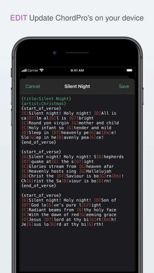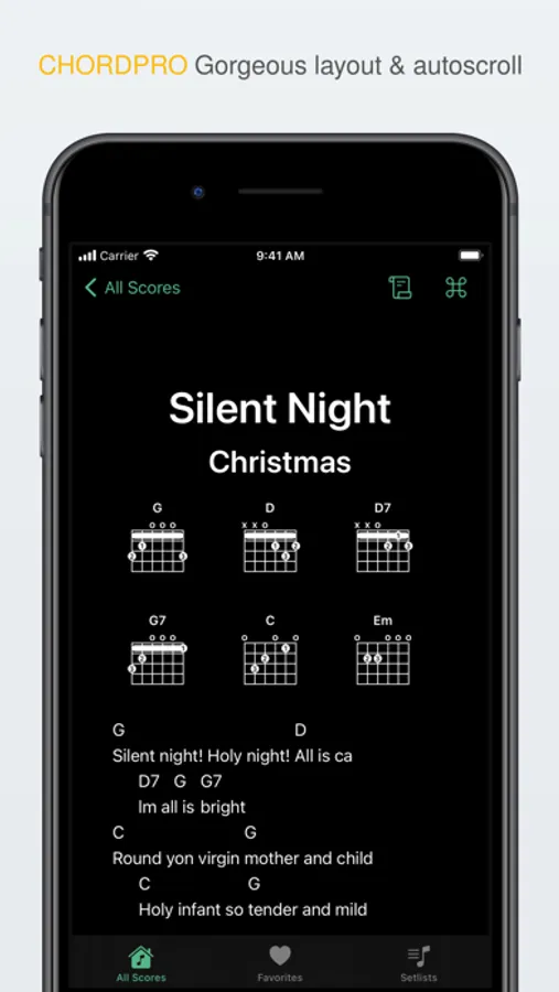 Guitar Scores is a guitar songbook which manages your ChordPro and PDF files. It displays ChordPro-files in a beautiful, orderly way, and allows you to edit your ChordPro files if needed. Guitar Scores allows to create custom sets so you can group songs for different gigs.