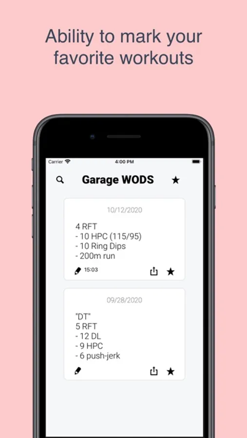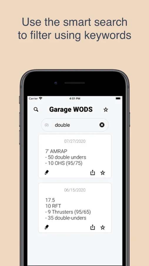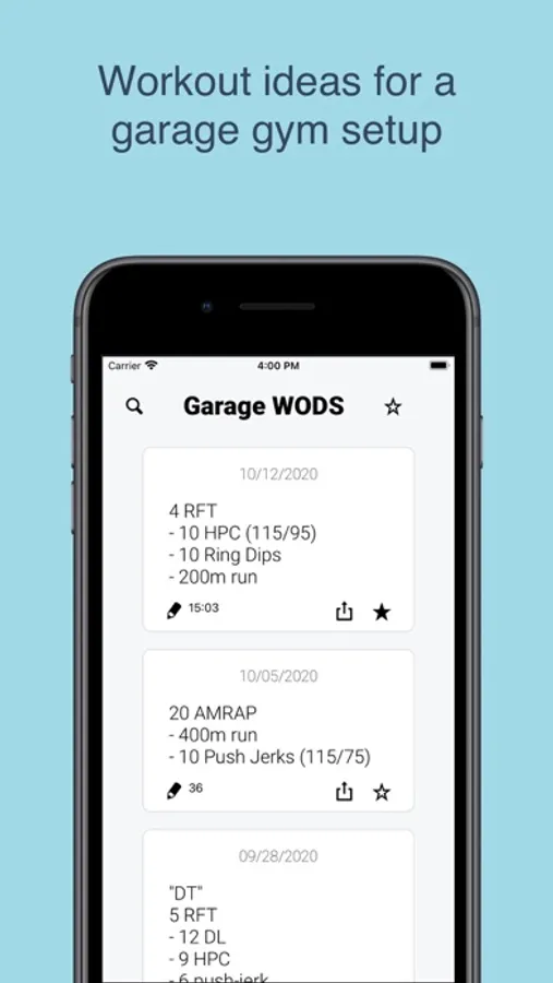 Weekly workout ideas perfectly fit for a garage gym environment. Keep track of your favorite workouts and share them with friends! Use the smart search functionality to quickly filter for specific keywords.