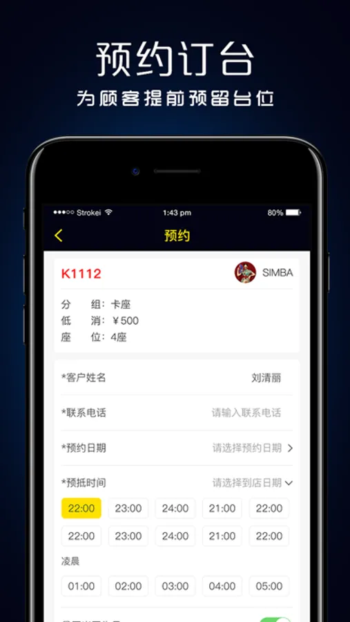 营销人员可以通过夜乐营销端为顾客订台,提前预留台位,顾客到店后由咨客直接开台。
