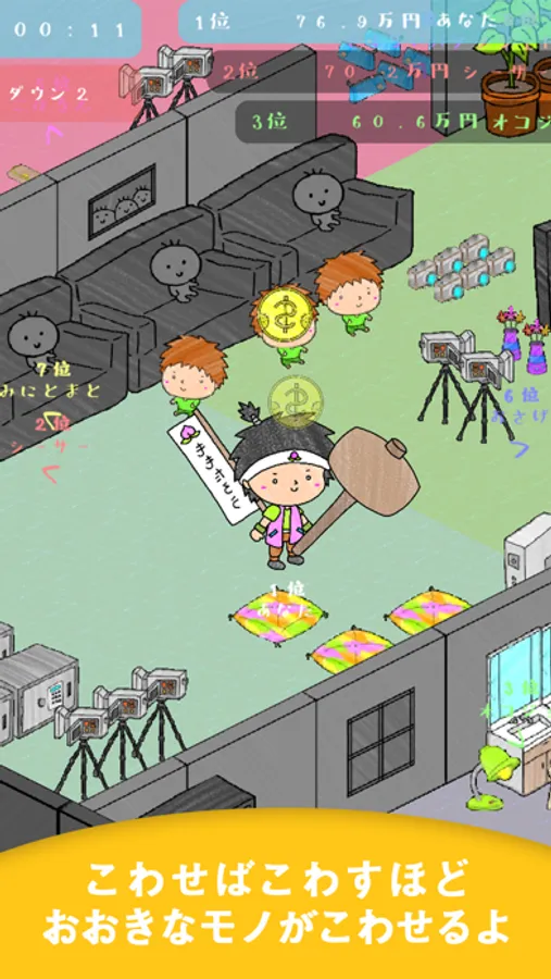 ・制限時間内にたくさんハンマーでたたいてこわしてスコアアップ