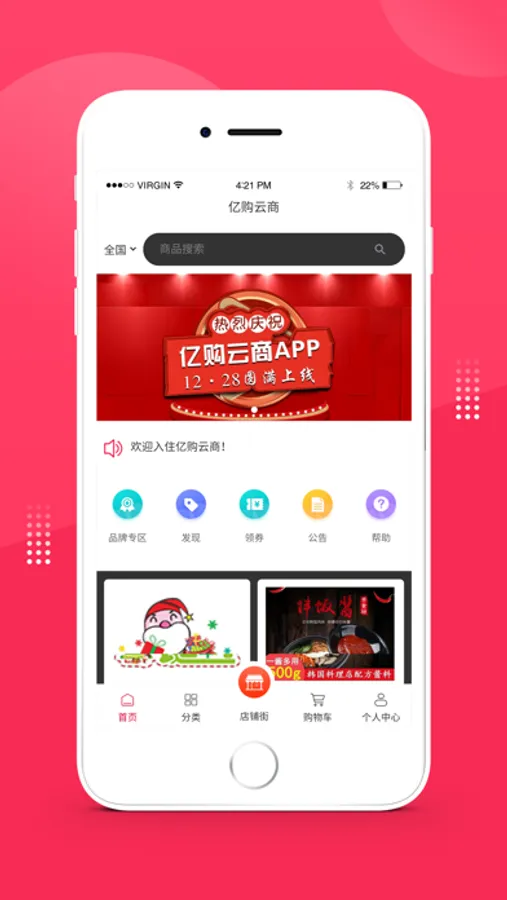 亿购云商打造一站式社交电商供应链商城,联合各个行业的优质商家入驻,汇聚物美价廉的商品,丰富品类满足美好生活的需要,用户可以方便快捷地在手机商城APP里选购喜欢的商品,参与优惠活动,享受产品福利。