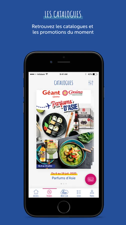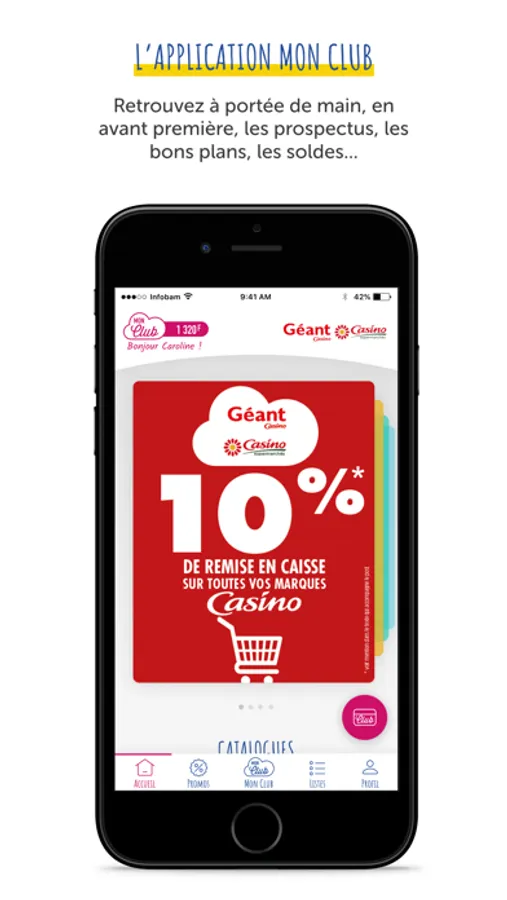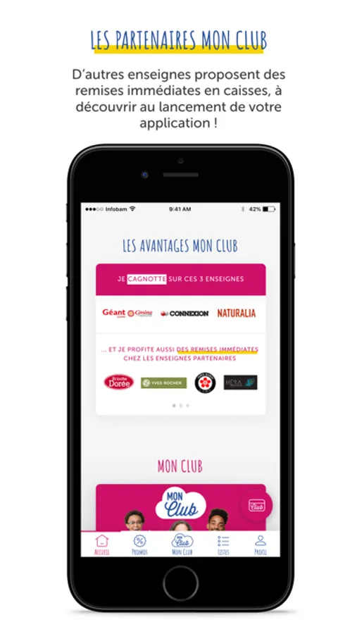Accueil : Dès le lancement de l’Application, découvrez ici les remises et actualités de tous les partenaires Mon Club. Cette section vous permet également de consulter rapidement les catalogues, les offres du moment, vos listes de courses, ainsi que le solde de votre cagnotte. Consultez régulièrement l’Application Mon Club pour faire le plein d’avantages et de réductions sur vos courses du quotidien, et sur vos achats plaisirs.