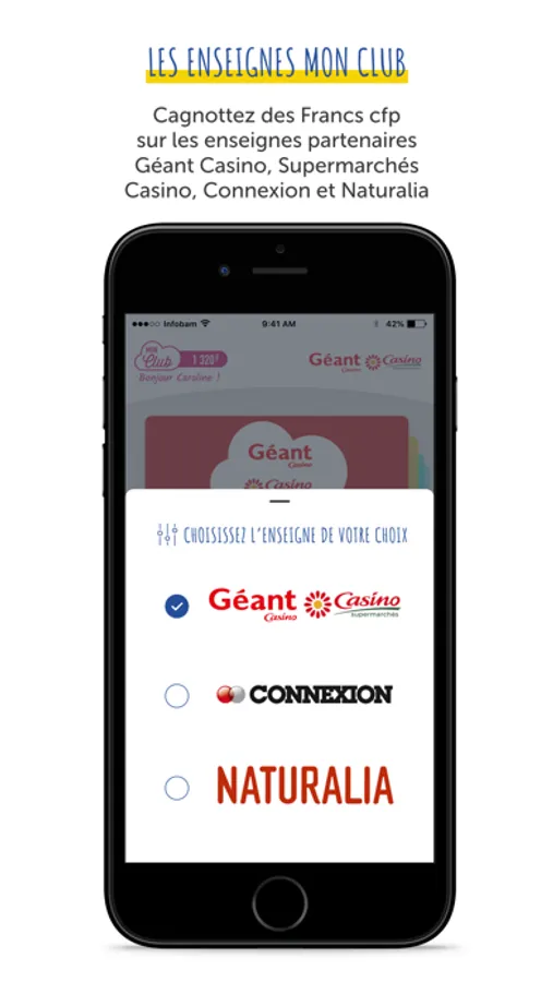 Navigation multi-enseigne : 3 enseignes vous permettent de cumuler des F cfp sur votre cagnotte. Il s’agit des hypermarchés Géant Casino, des supermarchés Casino et des magasins Connexion et Naturalia. Tapotez le logo en haut à droite pour choisir votre enseigne et découvrir ses offres et deals exclusifs. Les autres partenaires vous proposeront des remises immédiates en caisses, sous condition de présentation de l’Application.