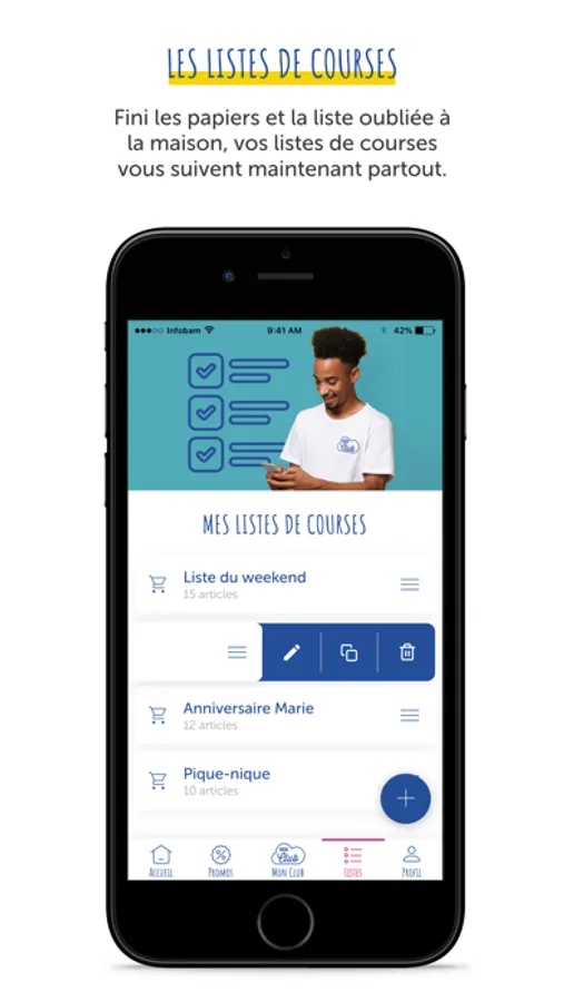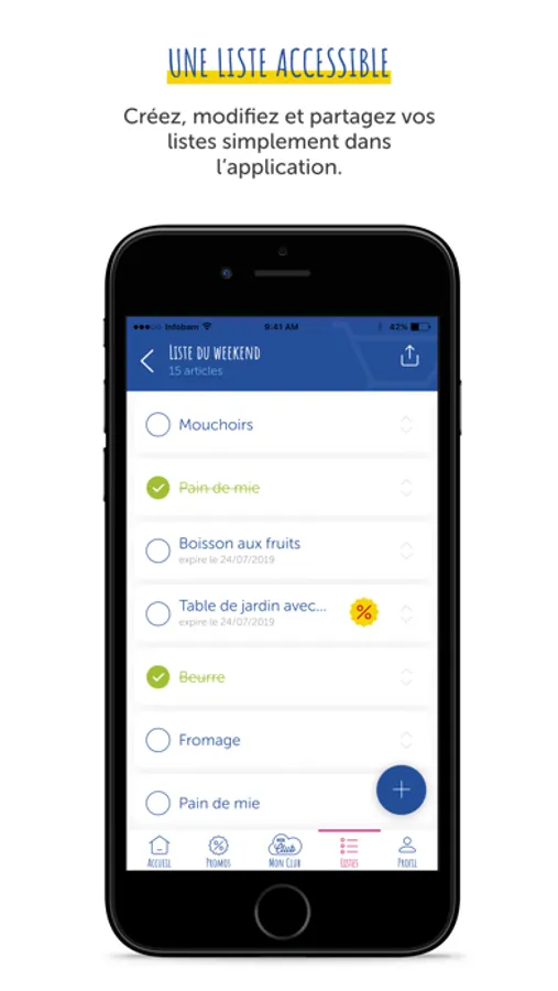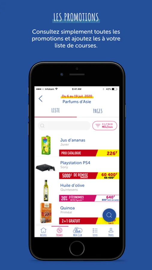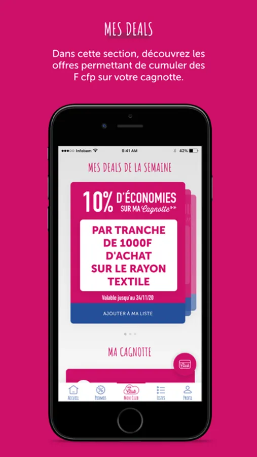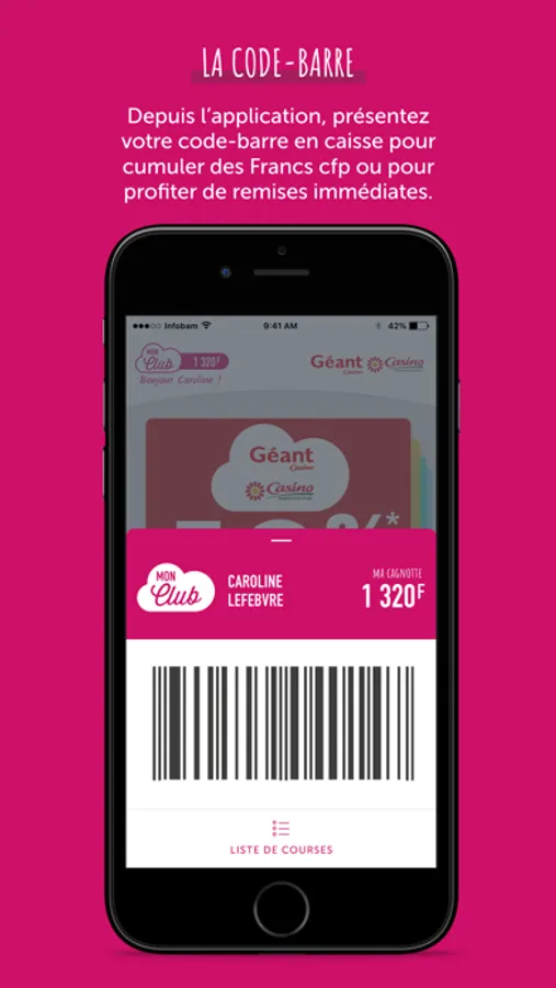 Mes Deals et Mon Club : Découvrez les offres permettant de cumuler des F cfp sur votre cagnotte. Vous pouvez également consulter le solde de votre cagnotte, utilisable en caisses. Listes : Vous aurez la possibilité de créer différentes listes de courses, que vous pourrez partager avec vos proches. Finis les papiers et la liste oubliée à la maison.