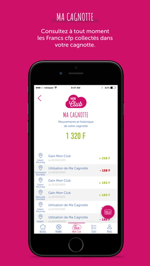 Avec l’Application Mon Club - Nouvelle Calédonie, emportez votre carte de fidélité partout avec vous en Nouvelle-Calédonie. Elle vous permettra de cumuler des F cfp sur votre cagnotte et de profiter d’autres avantages et remises exclusives. Téléchargez l’Appli pour découvrir tous nos partenaires et les promotions du moment ! Découvrez ci-dessous un aperçu des fonctionnalités de l’Application Mon Club.