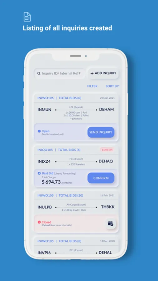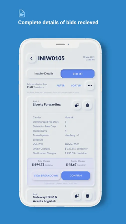 - Spot rate discovery- Enter shipments details like container size, number of containers, port codes, and get instant quotes from your reliable freight forwarders. Compare and book immediately!