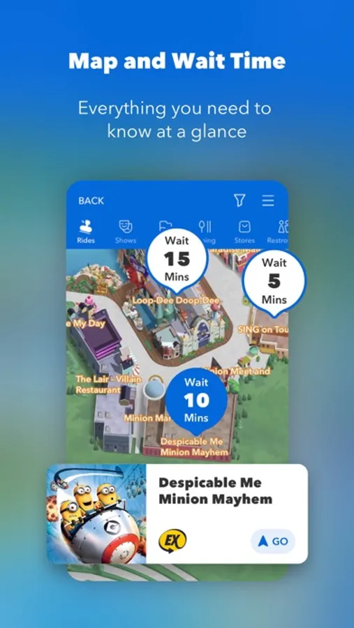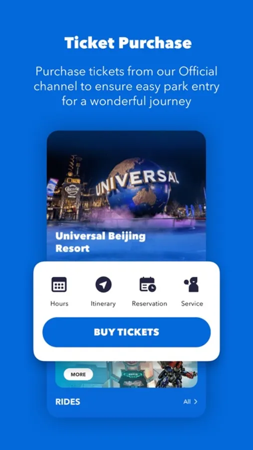 Universal Beijing Resort Official App functions include tickets purchase, hotels reservation, resort map, instruction within the resort, and official guides, you can check the rides/attractions wait times and show times to ensure you have a wonderful experience. The Universal Beijing Resort Official App will provide you with diversified online services to enhance your experience!