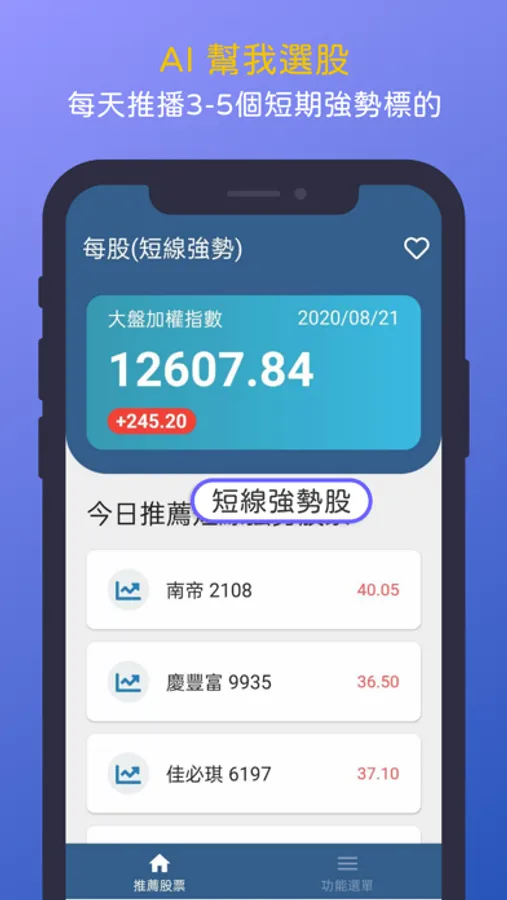 ● 每日由AI演算法找出今天強勢的股票供使用者查看。