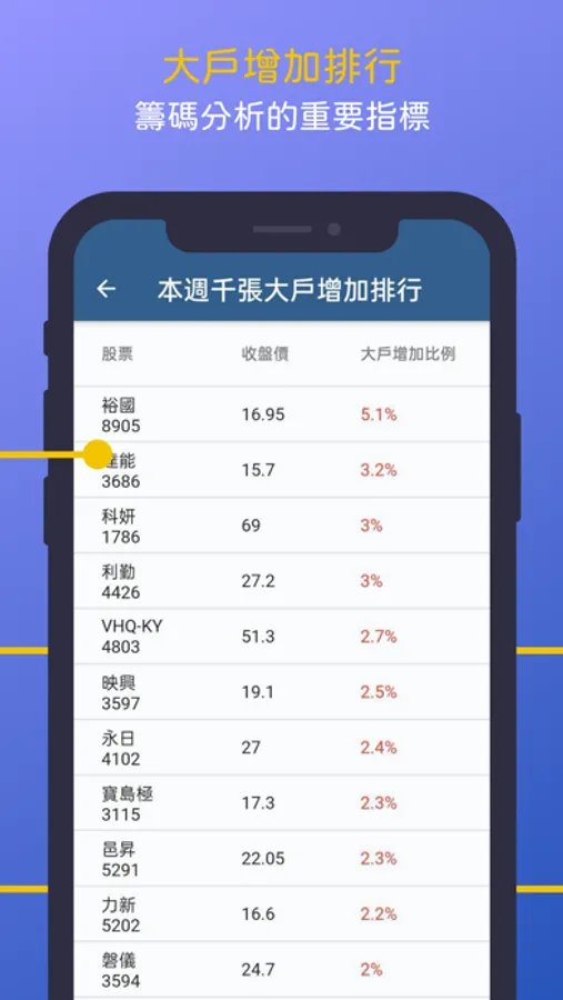 ● 千張大戶增加排行: 查詢本週千張大戶增加的比例排行,根據統計,大戶大增短期內股價上升的機率也會增加。歡迎各位投資朋友多加利用!