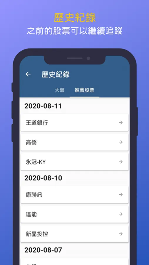 ● 歷史紀錄功能: 紀錄近10天大盤漲跌、近五天推薦標的供投資朋友們查看