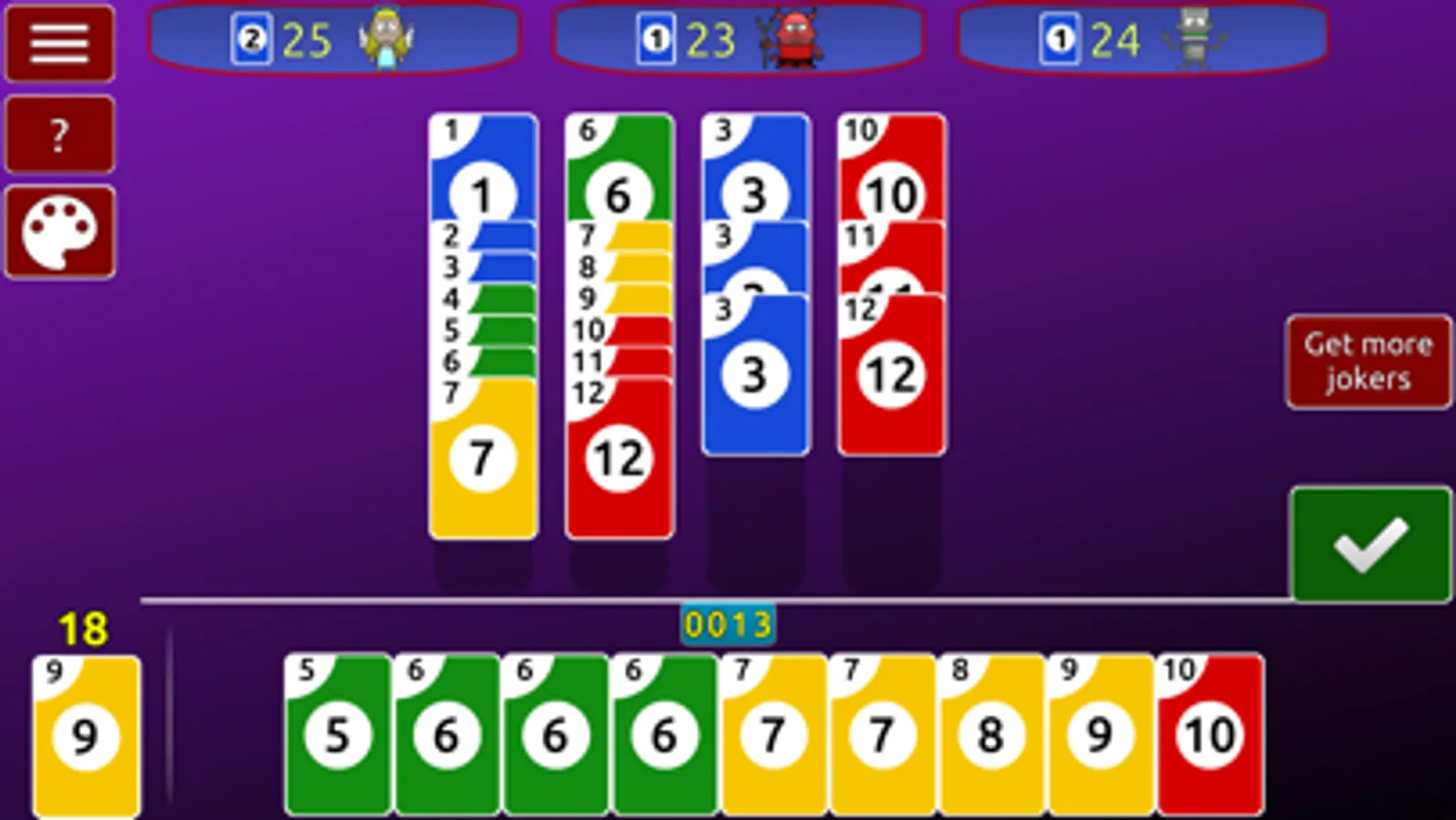 The game round begins with the player picking up a minimum number of auxiliary cards from the deck. If he has at least 3 cards in a sequence or set, he can start building a discard pile in the middle of the table.