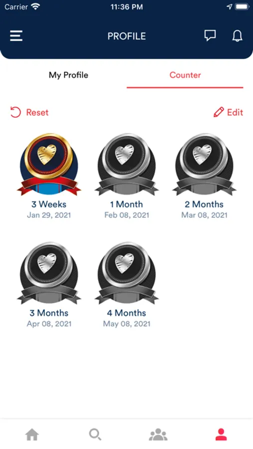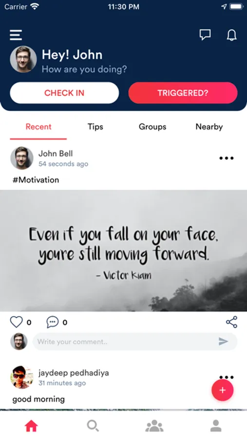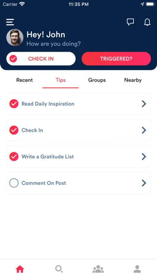Check-in: Track your journey with your sobriety counter. Check-in whenever you're feeling trigger to let others know you need an extra helping hand.