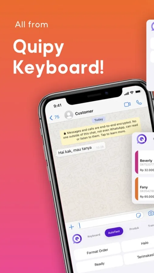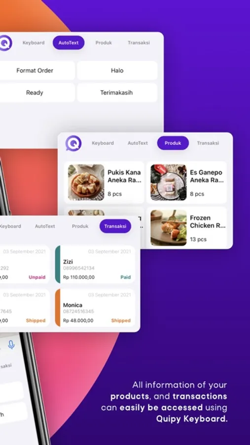 Quipy helps you to manage your transactions and product inventory. You can also access them directly, in form of shortcuts, from your very own Quipy keyboard. Therefore, you won’t need to waste so much time looking up for your data and this way, you can get back to your customers faster.