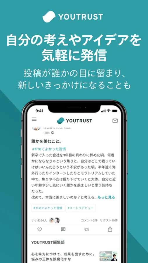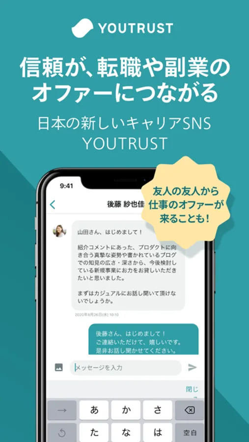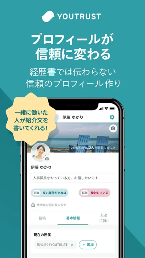 YOUTRUST(ユートラスト)は信頼でつながる 日本のキャリアSNS。友人や同僚と仕事の話を楽しみながら、新しいつながりやキャリアに役立つ情報・あなたにあった仕事と出会えます。無料で募集も掲載可能。30秒で簡単に登録できます!