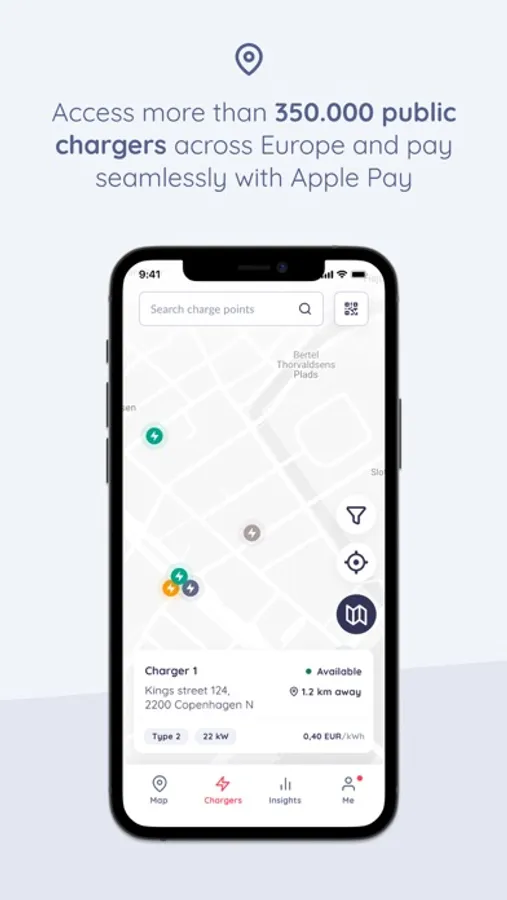 - Choose from multiple payment methods: Apple Pay, Google Pay, Credit and Debit Cards, Monta Wallet, Charge Key (RFID Card), MobilePay, Vipps, etc.