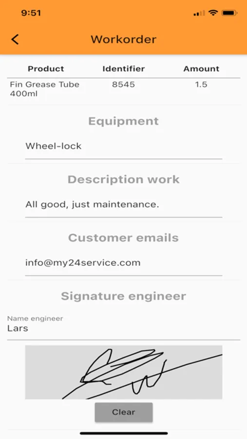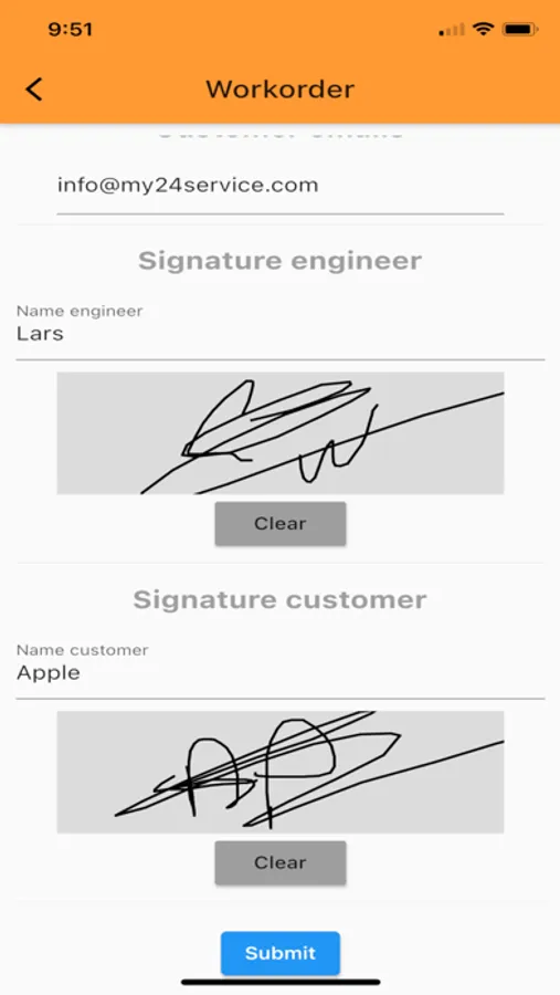This App is the native implementation of the mobile My24Service functionality. You can start orders, register workhours, materials, end order and sign the workorder together with the customer.
