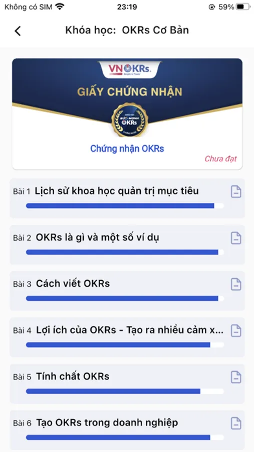 Thiết kế chương trình học gồm các bài học, bài kiểm tra ngắn, bài thi trắc nghiệm & bài thi viết sẽ đảm bảo nhân viên hiểu Đúng về OKRs khi đã lấy được chứng nhận. Doanh nghiệp chỉ cần đưa ra yêu cầu “hãy lấy chứng nhận của VNOKRs đúng thời hạn”.