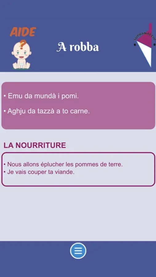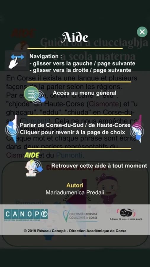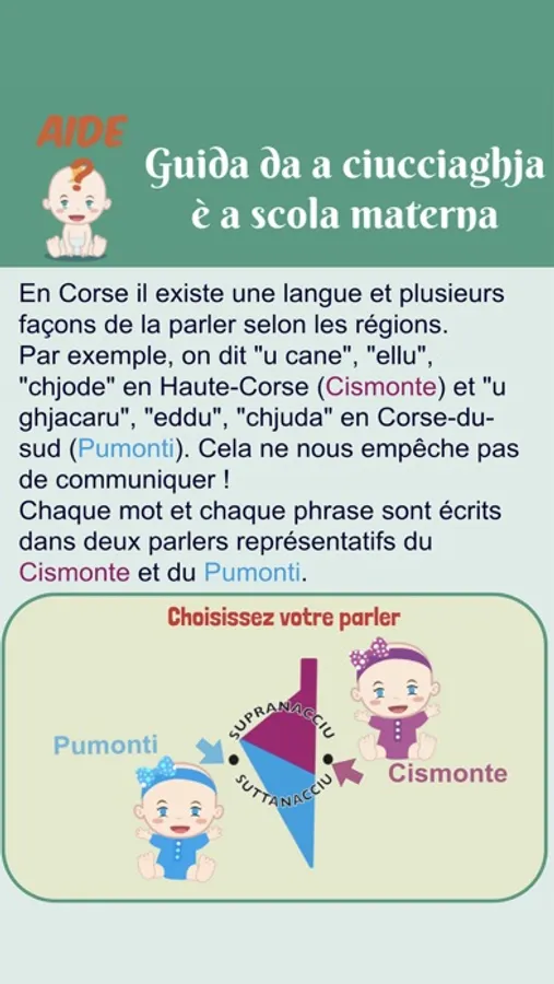 Les personnels des métiers de la petite enfance et les parents trouveront ici des phrases usuelles, du vocabulaire, des comptines et des chansons en langue corse pour leur pratique quotidienne. Cela concerne les échanges avec les enfants, entre collègues et entre mammareddi et parents. Des indications de prononciation et surtout l’écoute de tous les mots, phrases etc permettront des progrès rapides. De courtes vidéos-tutoriels aideront en outre à la prise en main des outils (application, livre, affiches, site).