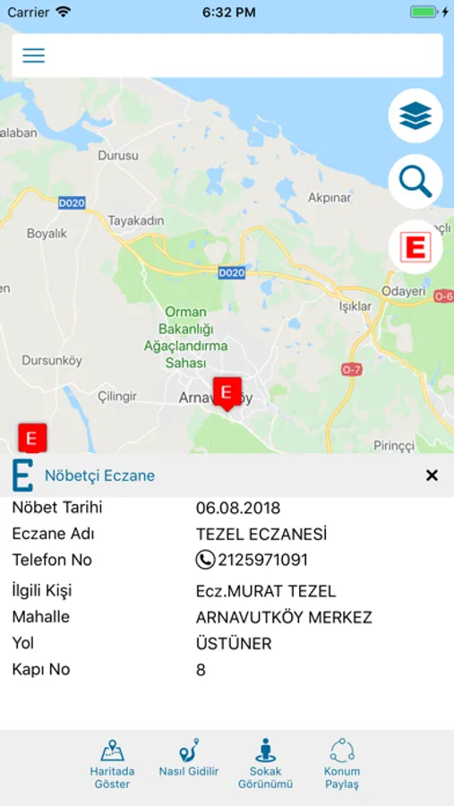 Arnavutköy’deki eczaneler, hastaneler, okullar, camiler vb. bilgileri sorgulayabilir ve yol tarifi alabilirsiniz.