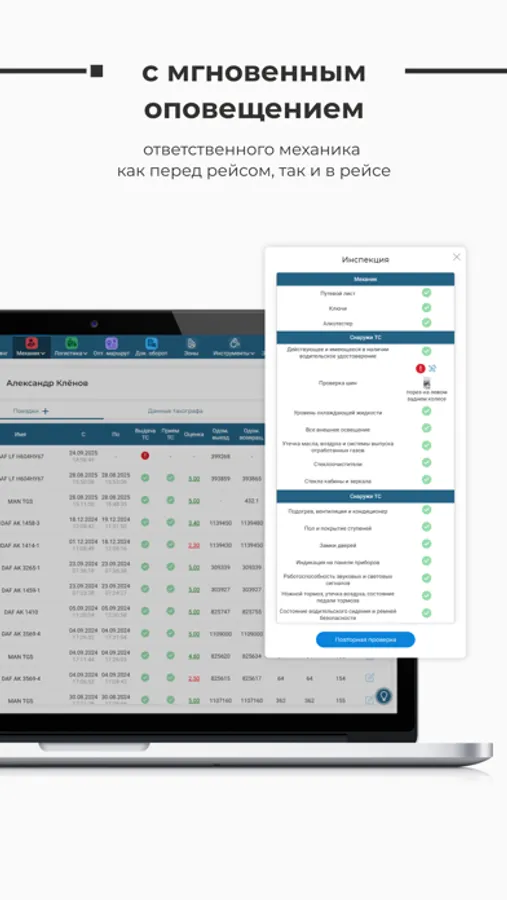 - проходить инспекцию приёмки и возврата автомобиля при выезде на маршрут и возврате с него согласно гибко настраиваемому шаблону.