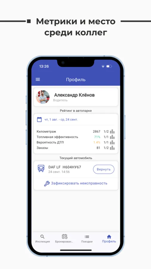 Показывать ВОДИТЕЛЮ ключевые метрики, связанные с его эффективностью и объемом выполненных работ: