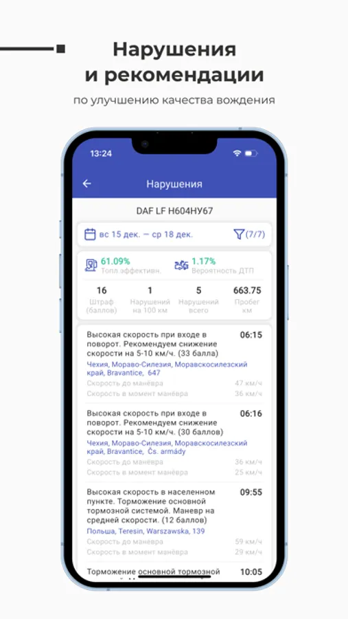 - нарушения по поездкам, которые помогут понять, как улучшить качество вождения, увеличить топливную эффективность и уменьшить вероятность ДТП в будущем.