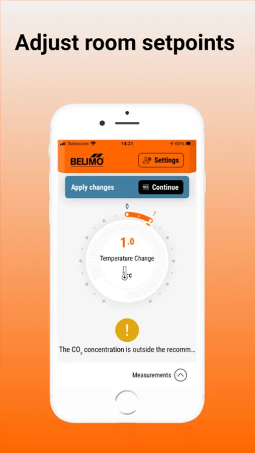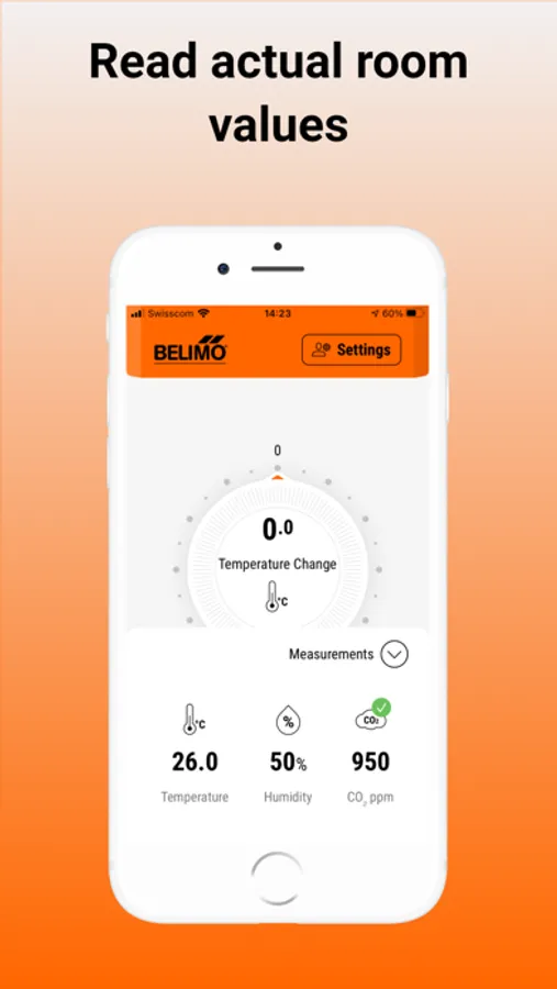 The Belimo Display App is the most innovative of its kind to access sensors. With the intuitive end-customer app, the current room values can be displayed and setpoints can be adjusted. Access protection prevents input by unauthorised people.
