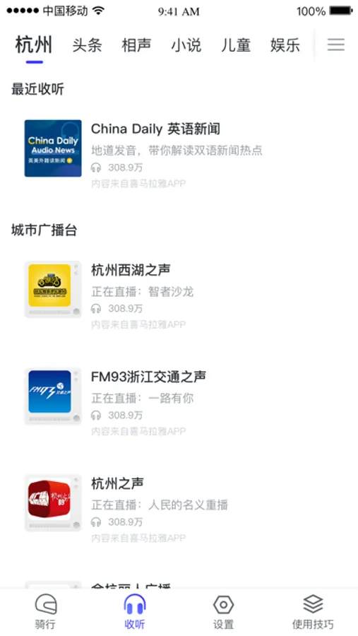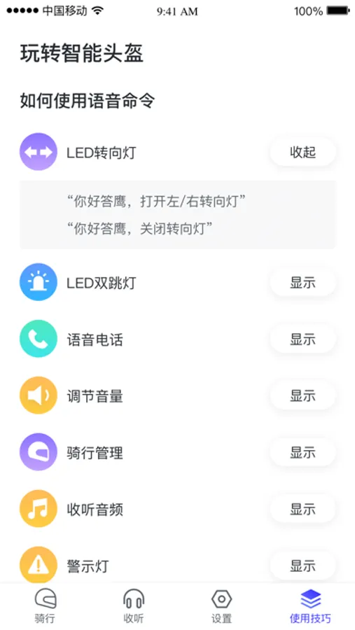支持答鹰系列智能头盔,向骑行用户提供基于语音交互的智能功能和互联网内容,包括骑行管理、蓝牙电话和音乐播放、智能LED、语音聊天、导航语音播放、组队骑行模式、收听电台和音频内容等。