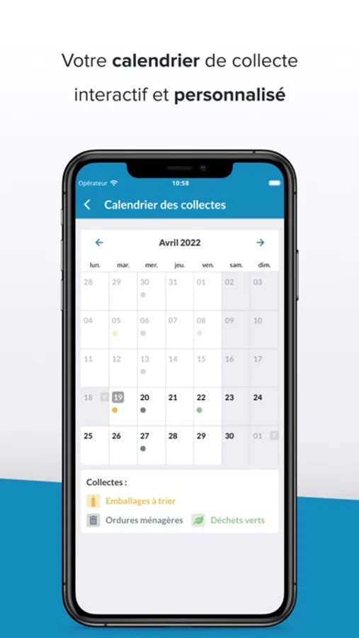 L’application vous donne automatiquement le jour du prochain passage du camion pour les collectes de proximité d’ordures ménagères, emballages à trier et déchets verts. Vous avez également accès au planning annuel des collectes, avec prise en compte des jours fériés.