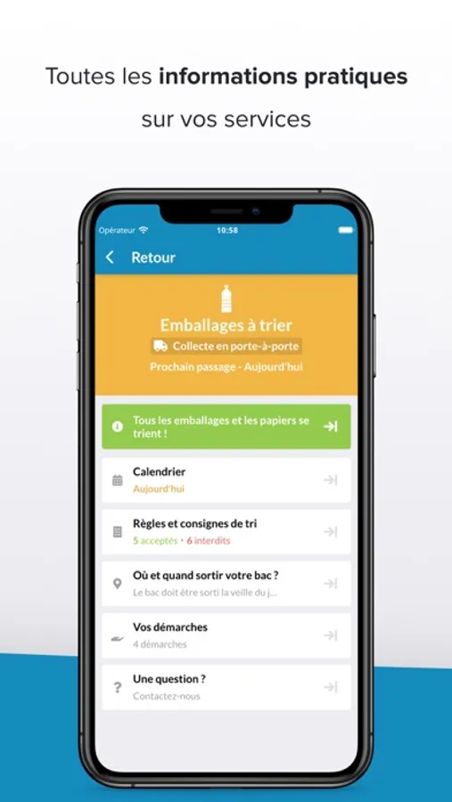 Elle recense toutes les informations utiles au tri et à la réduction de vos déchets, en fonction de votre adresse : planning personnalisé de collecte, position et disponibilité des points de collecte de proximité, horaires et informations pratiques sur les déchèteries, consignes de tri et bien plus encore.