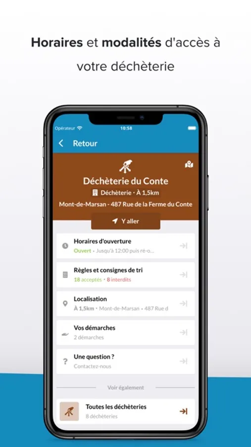 L’application recense les points de collecte les plus proches de vous grâce à la géolocalisation, et vous donne les règles et consignes de tri à respecter pour chaque service. Vous n’aurez plus de doute sur la localisation d’un point de collecte ou sur les horaires d’ouverture des déchèteries : la bonne information est dans l’application !