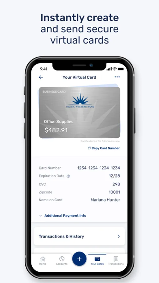 Pacific Western Bank Commercial Card customers can now make and manage business payments with the PWB Virtual Card app. In this easy-to-use app, you can instantly create and send secure virtual cards to anyone in your network, improve oversight of spending, and automate reconciliation. It's absolutely free for businesses with no commitment.
